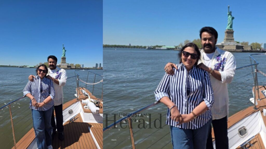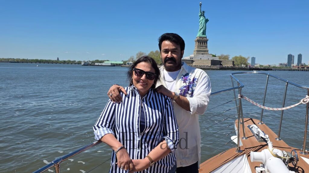 Mumbai, April 28: There is a photograph going around today that has nothing to do with box office numbers or film announcements. It shows Mohanlal and his wife, Suchitra, standing in front of the Statue of Liberty in New York, smiling the kind of smile that does not need context. The caption under it reads: “38 years later… and somehow, it still feels like the beginning.”
